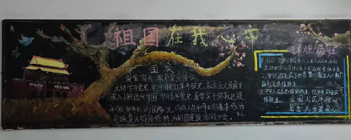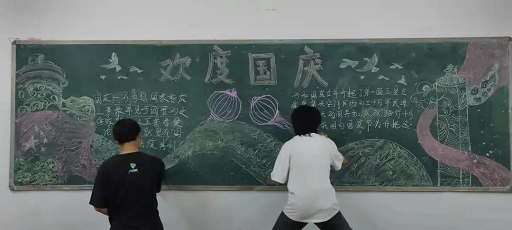 在各個(gè)班級(jí)中,有很多忙的不可開(kāi)交的身影,學(xué)生正忙著更換國(guó)慶主題的黑板報(bào)。他們用圖文并茂的形式向祖國(guó)送去祝福。