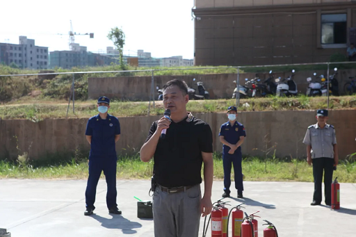 ▲消防救援大隊專業(yè)人員為師生講解滅火器使用方式和進行滅火器使用示范