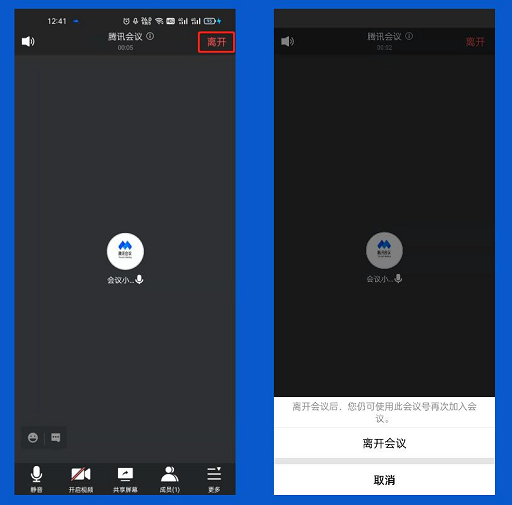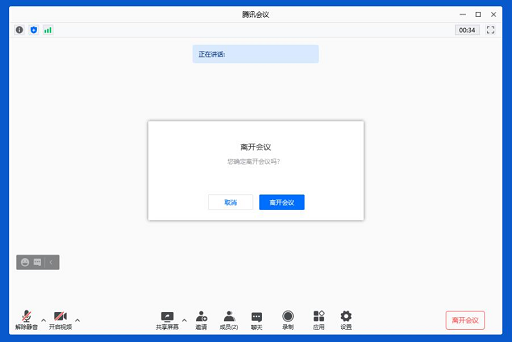 當(dāng)您的身份為成員時(shí),找到離開會(huì)議按鈕,點(diǎn)擊以后可以退出當(dāng)前會(huì)議,若會(huì)議沒(méi)有結(jié)束,您可以通過(guò)會(huì)議號(hào)再次回到該會(huì)議;